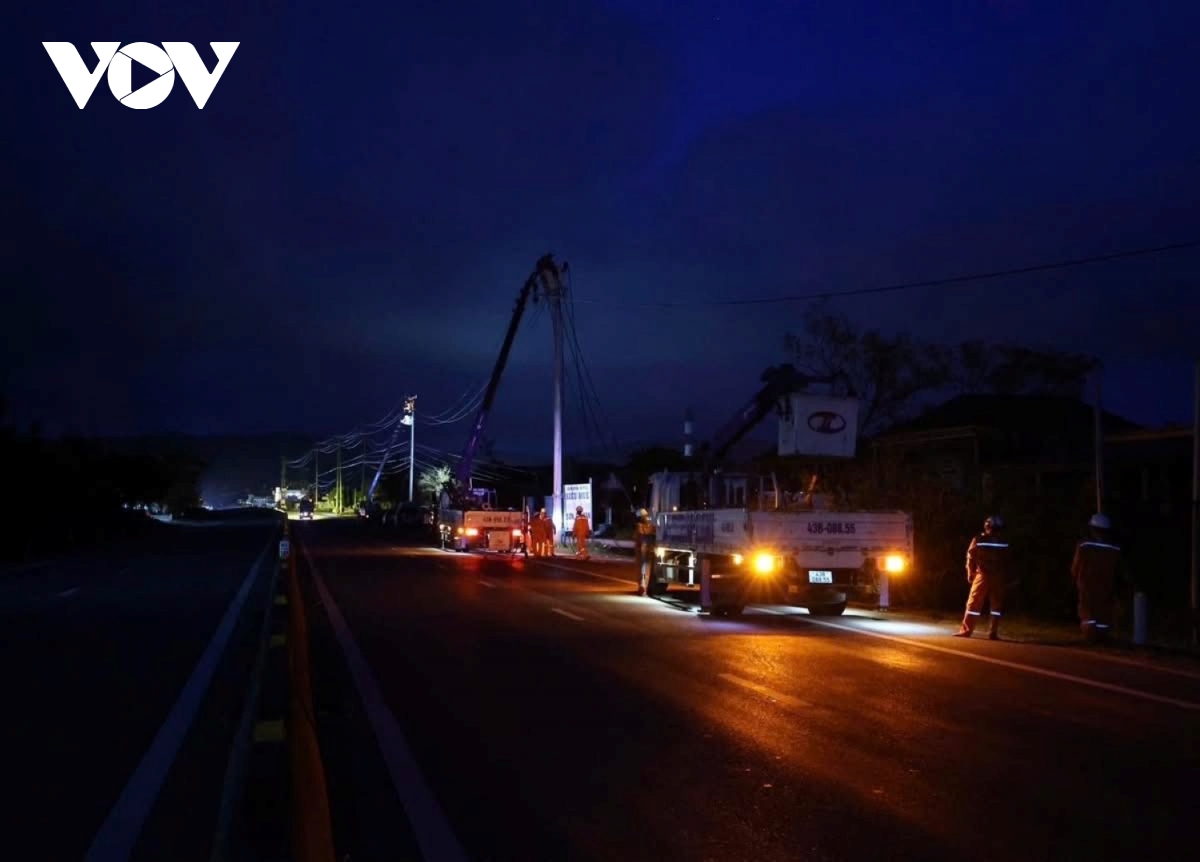 VOV.VN - Bão số 10 kèm theo mưa to, gió giật mạnh làm hệ thống điện tại tỉnh Quảng Trị bị sự cố khá nghiêm trọng. Hàng trăm cột điện bị gãy đổ, nhiều đường dây điện bị đứt, vỡ sứ làm gián đoạn việc cung cấp điện phục vụ sinh hoạt, sản xuất, kinh doanh của người dân.