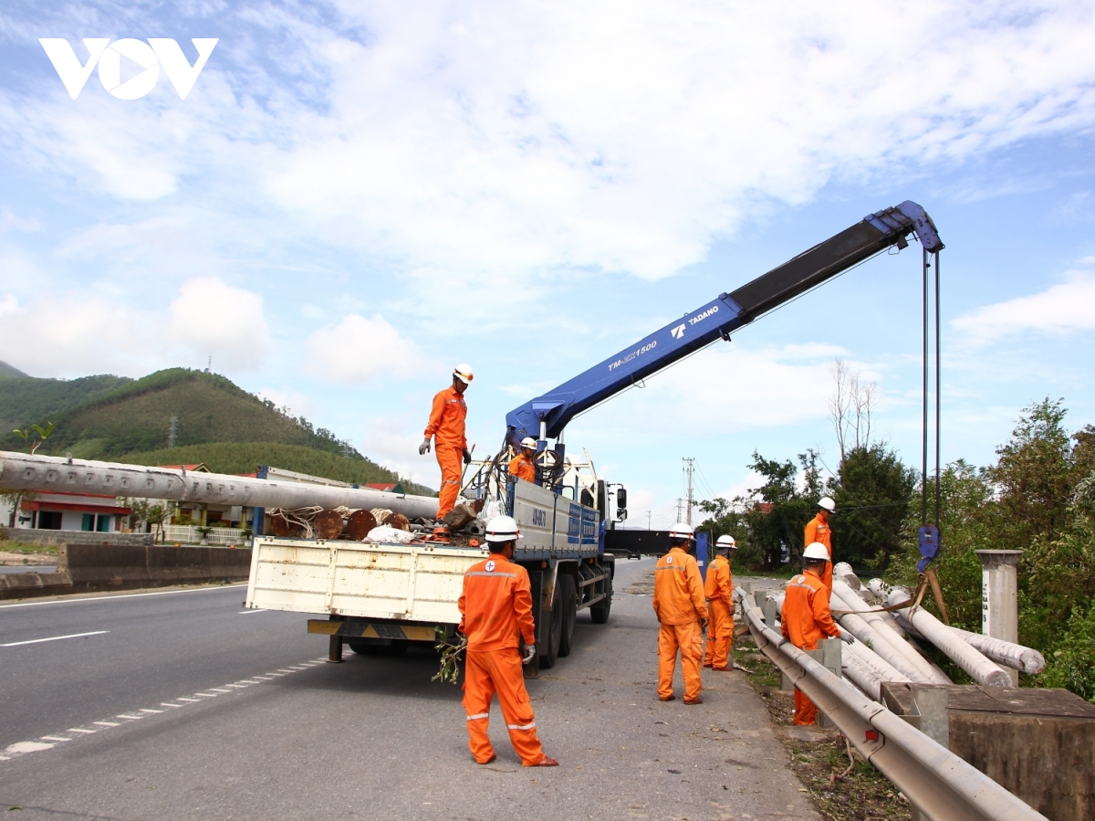 Ông Hoàng Hiếu Trung, Giám đốc Công ty Điện lực Quảng Trị cho biết, đơn vị gấp rút huy động tối đa phương tiện xe cẩu, xe nâng người, xe thang chuyên chở vật liệu, phương tiện phục vụ thi công để đẩy nhanh công tác khôi phục cấp điện.