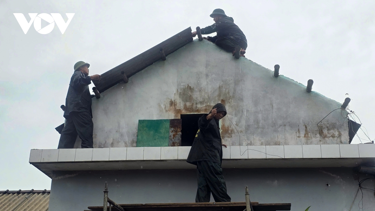 Lực lượng dân quân hỗ trợ sửa nhà dân bị hư hại do bão số 10