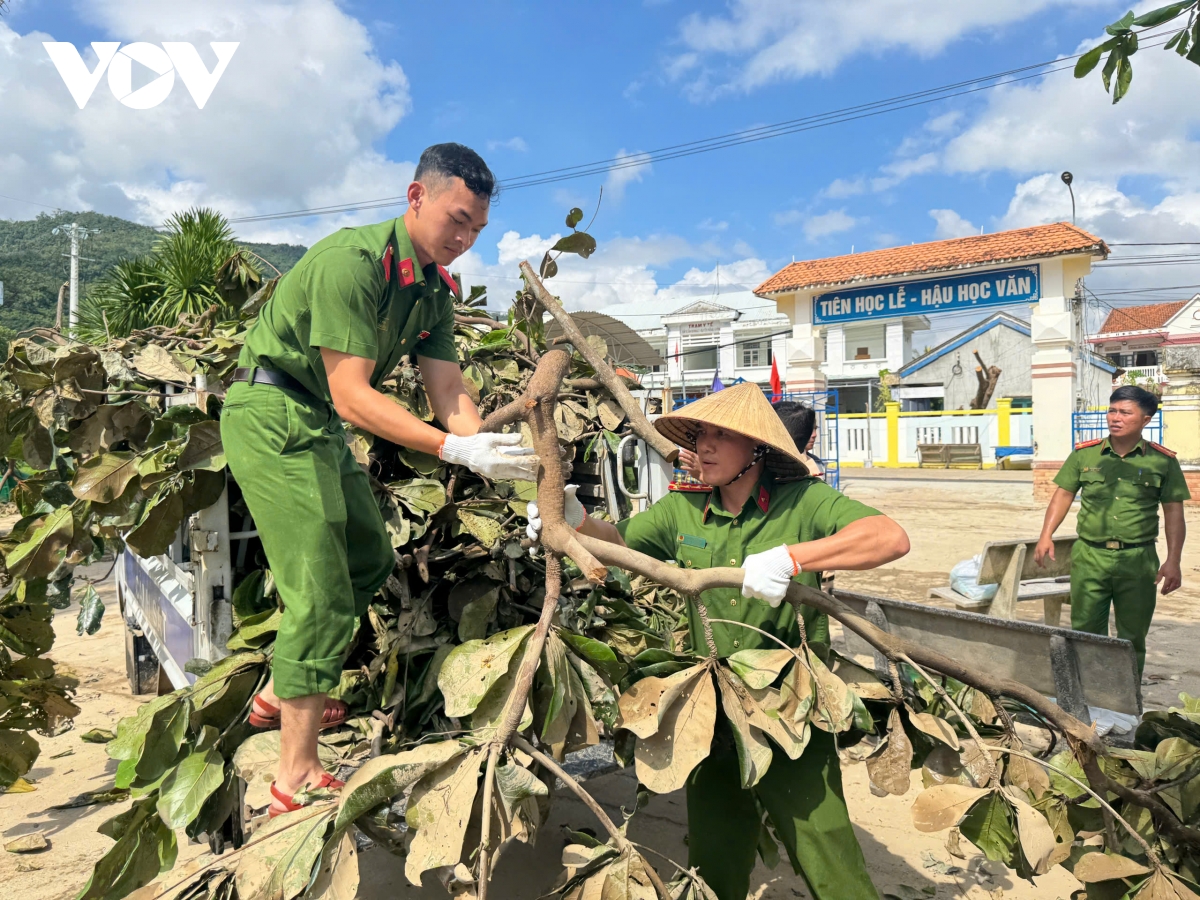Các chiến sĩ công an hỗ trợ dọn dẹp trường học để các cháu học sinh kịp đến lớp vào sáng thứ Hai, ngày 10/11