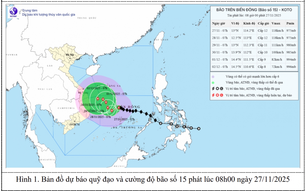 Hồi 7h ngày 27/11, tâm bão nằm ở khoảng 13,0 độ vĩ Bắc; 114,2 độ kinh Đông, cách đảo Song Tử Tây khoảng 180 km về phía Bắc.