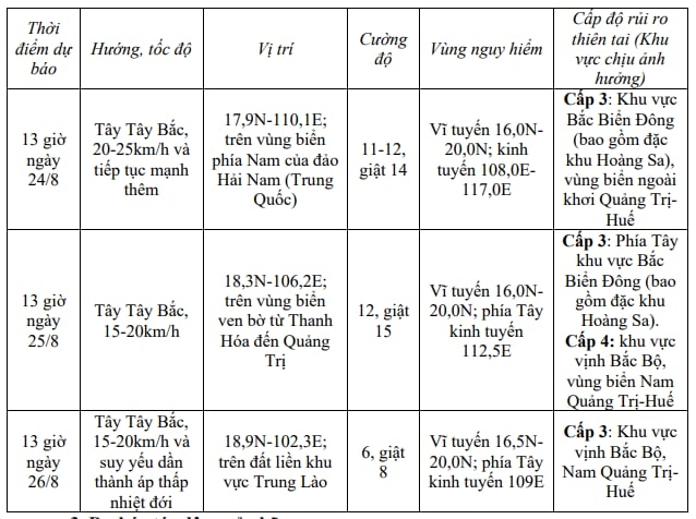 Từ trưa và chiều 24/8, vùng biển từ Thanh Hóa đến Huế (bao gồm Cồn Cỏ, Hòn Ngư) có gió mạnh dần lên cấp 6–8, sau tăng lên cấp 9–10, vùng gần tâm bão đi qua cấp 11–13, giật cấp 15. Sóng biển cao 4,0–6,0m, vùng gần tâm 6,0–8,0m. Biển động dữ dội.