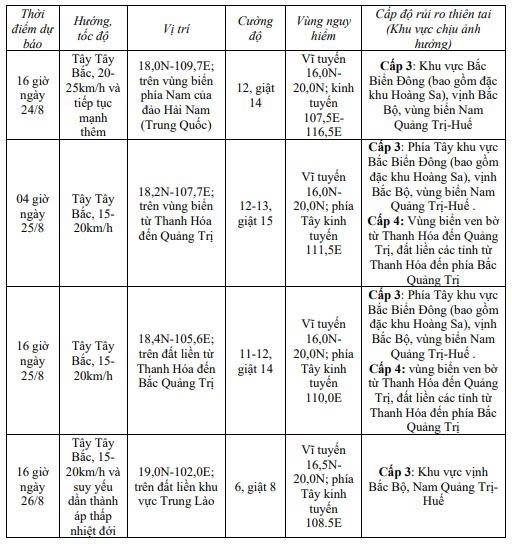 Từ trưa và chiều 24/8, vùng biển từ Thanh Hóa đến Huế (bao gồm đặc khu Cồn Cỏ, Hòn Ngư) có gió mạnh dần lên cấp 6-8, sau tăng lên cấp 9-10, vùng gần tâm bão đi qua cấp 11-13, giật cấp 15; sóng biển cao 4-6m, vùng gần tâm 6-8m; biển động dữ dội.