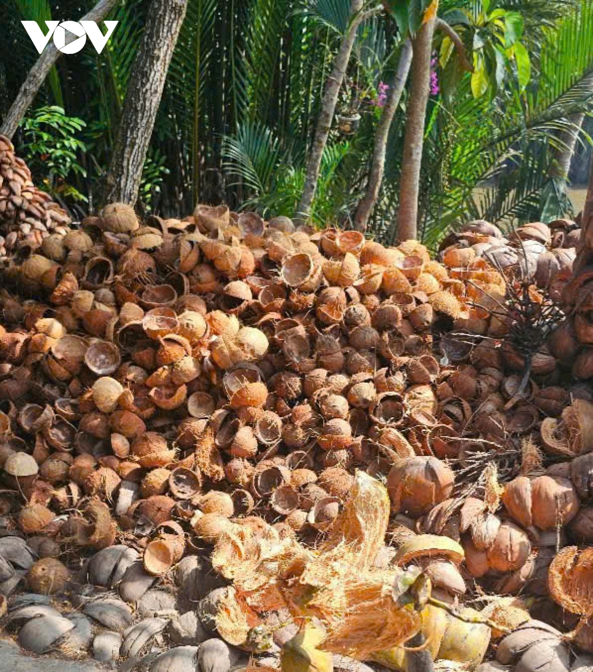 Gáo dừa- nguyên liệu đem vào lò đốt sản xuất than thiêu kết tại tỉnh Bến Tre