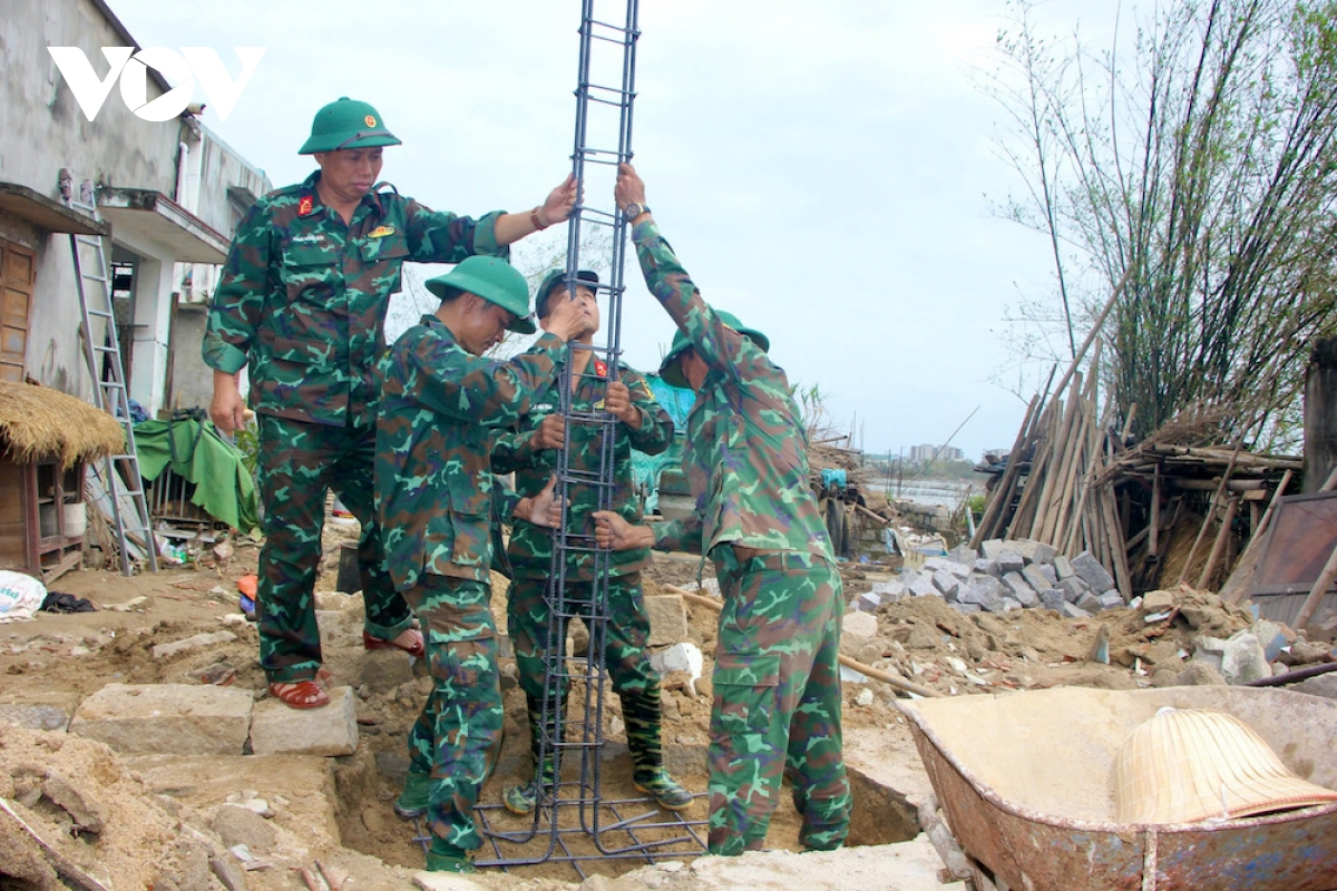 Cũng tại thôn Chánh Hữu, bộ đội Trường Quân sự Quân đoàn 34 đang giúp gia đình anh Ngô Đình Vị xây nhà. Căn nhà trong ngõ hẹp, đất thấp nên bộ đội đã chở đất nâng nền, tăng khả năng vượt lũ.
