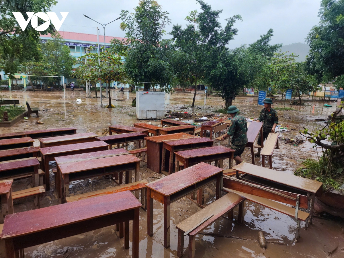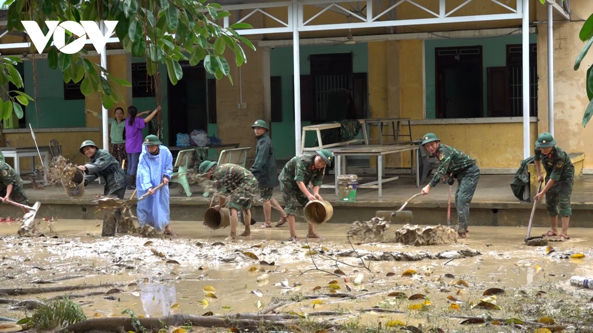 Chia sẻ với những khó khăn mà người dân và các cơ sở y tế, trường học, 100 cán bộ, chiến sĩ Trung tâm huấn luyện quân sự quốc gia 2, Quân khu 5 căng mình dưới mưa dọn dẹp hàng trăm căn phòng, hàng héc ta diện tích khuôn viên với hàng trăm khối bùn đất.