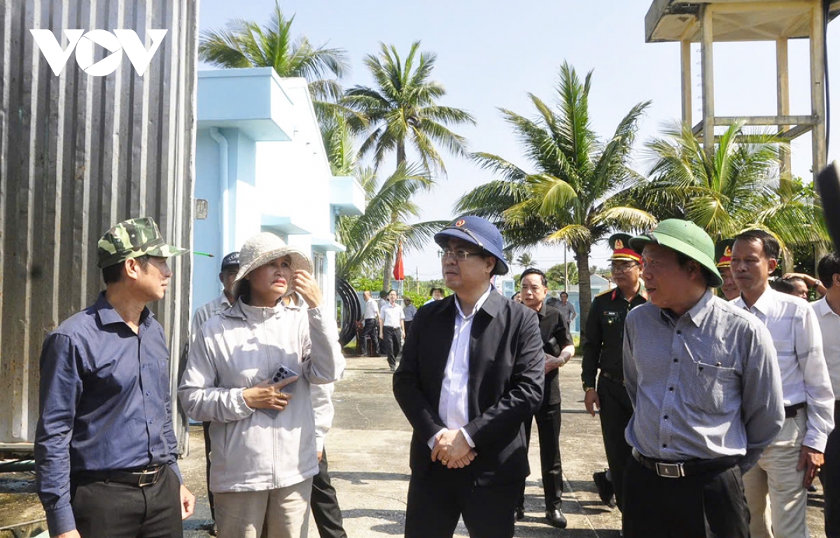 Ông Nguyễn Hoàng Giang, Chủ tịch UBND tỉnh Quảng Ngãi (áo khoác đen) kiểm tra nhà máy nước trên đặc khu Lý Sơn