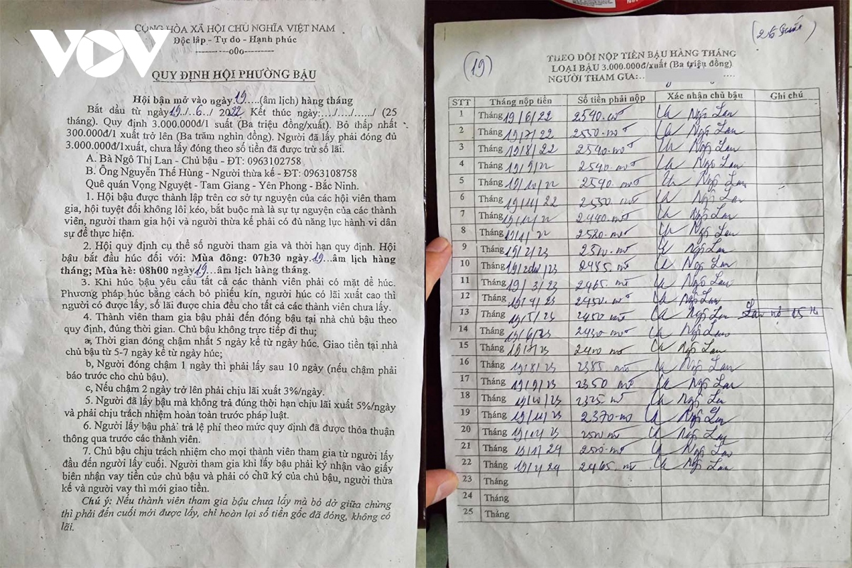 Trước dư luận đang xôn xao về vụ vỡ nợ, gây ảnh hưởng lớn đến nhiều người dân tại thôn Vọng Nguyệt, xã Tam Giang, huyện Yên Phong, phóng viên Báo Điện tử VOV đã tìm về làng Vọng Nguyệt nơi được mệnh danh là “tứ lệnh tộc” vùng Kinh Bắc xưa, nổi bật với truyền thống khoa bảng và gặp được cô Nguyễn Thị Tài ở thôn Vọng Nguyệt, xã Tam Giang (Yên Phong, Bắc Ninh). Cô Tài cho biết, gia đình cô Tài có 4 người con tham gia "chơi bậu" được 30 tháng nay với gần 186 suất, tổng số tiền gốc gần 500 triệu đồng.