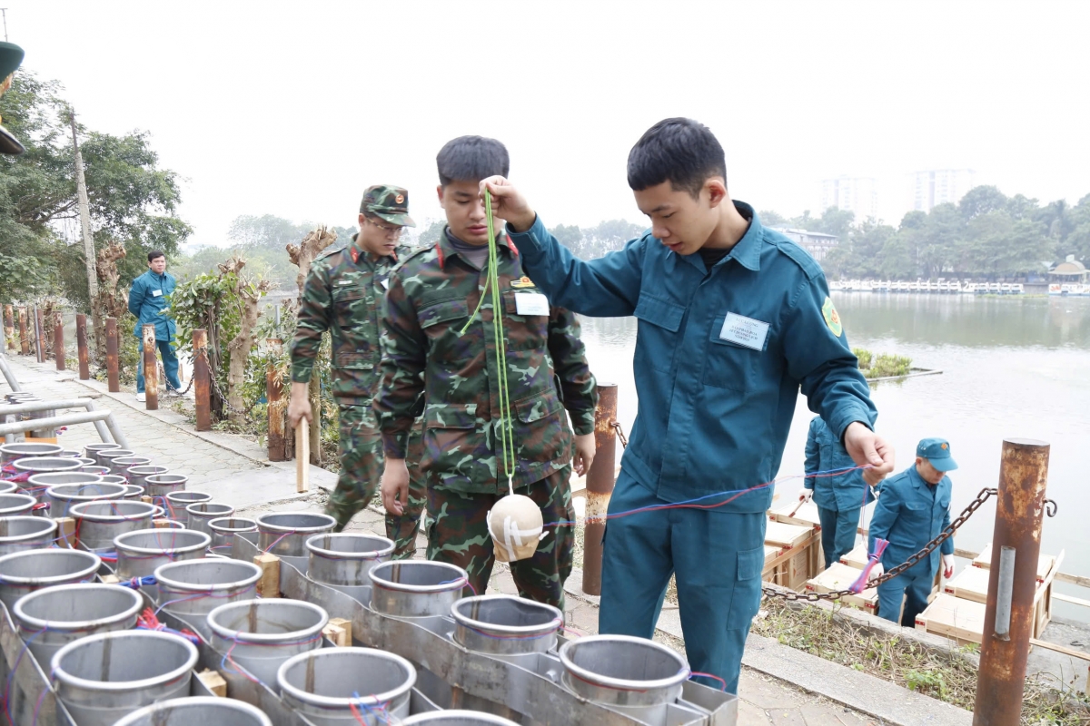 Lực lượng chức năng tiến hành thả các quả đạn tầm cao vào ống phóng. Các ống phóng được làm bằng chất liệu kim loại, có các đường kính khác nhau để phù hợp với kích cỡ từng loại pháo hoa.