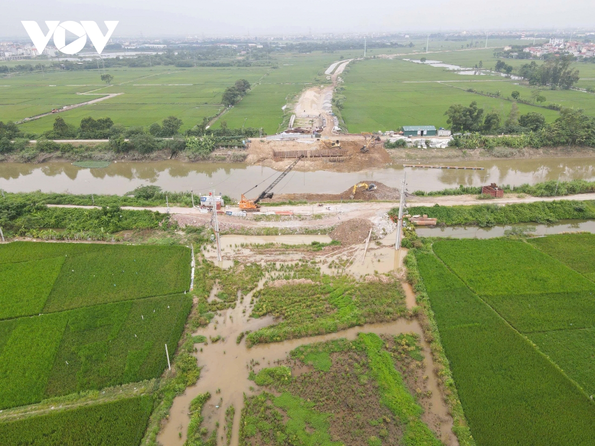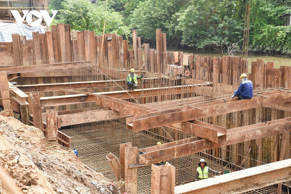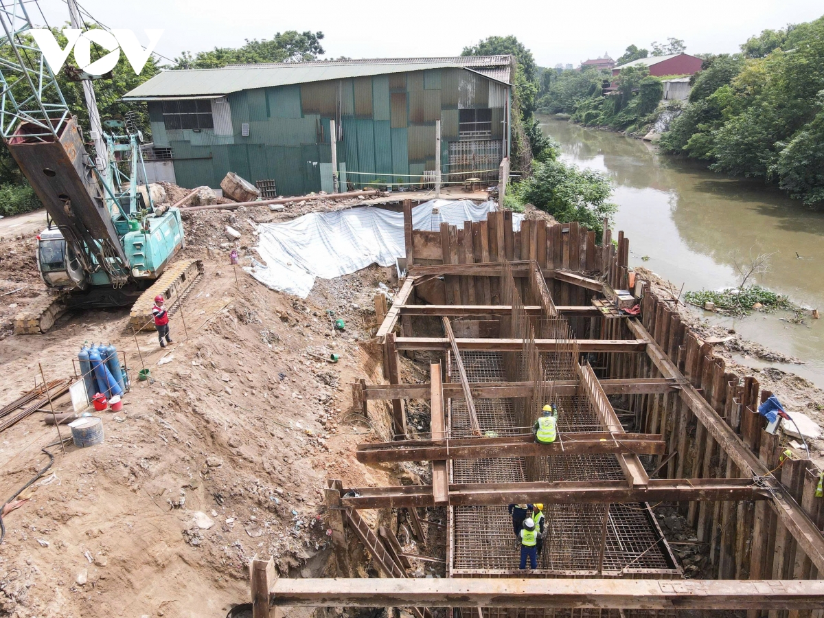Tại gói thầu số 13 (xây dựng cầu vượt kênh Trịnh Xá), hàng chục công nhân và các thiết bị máy móc cũng được nhà thầu huy động thi công ngày đêm để đảm bảo tiến độ.