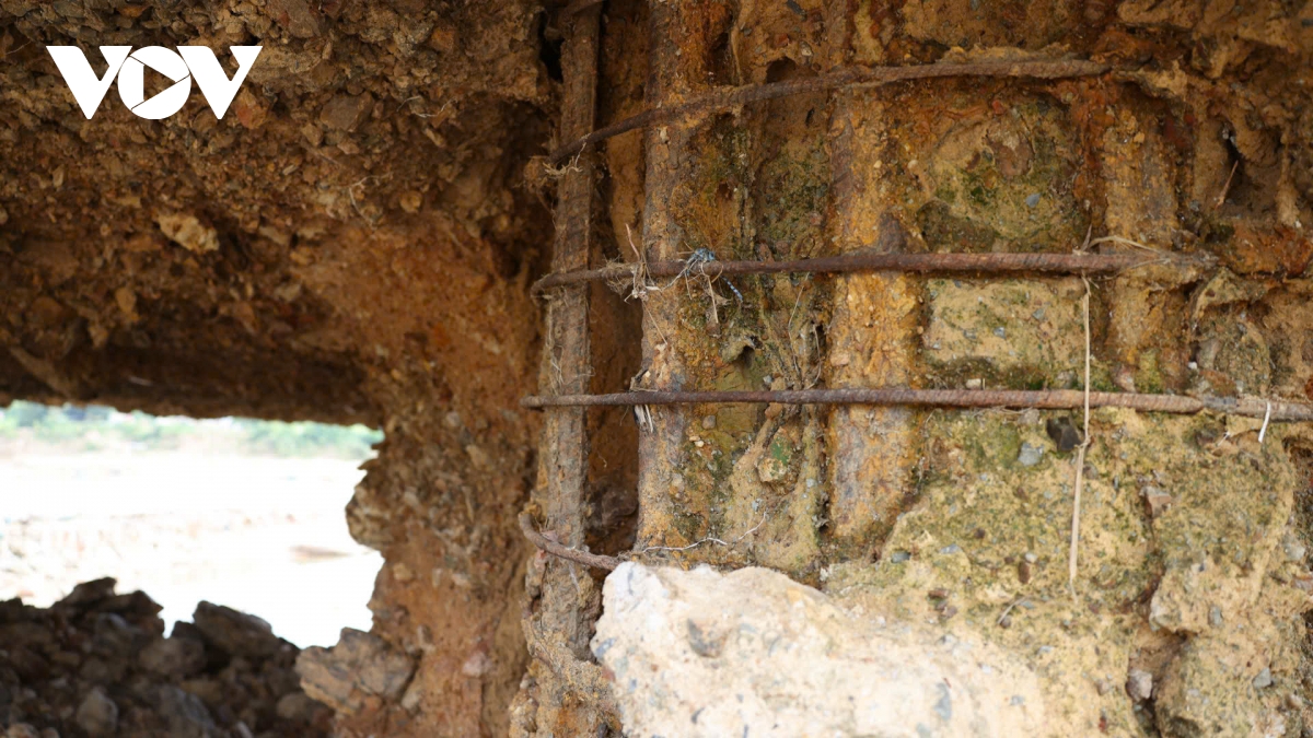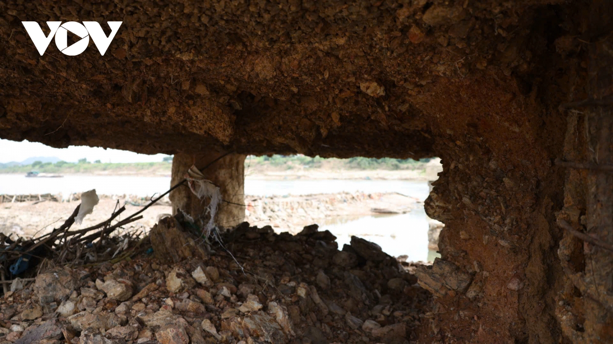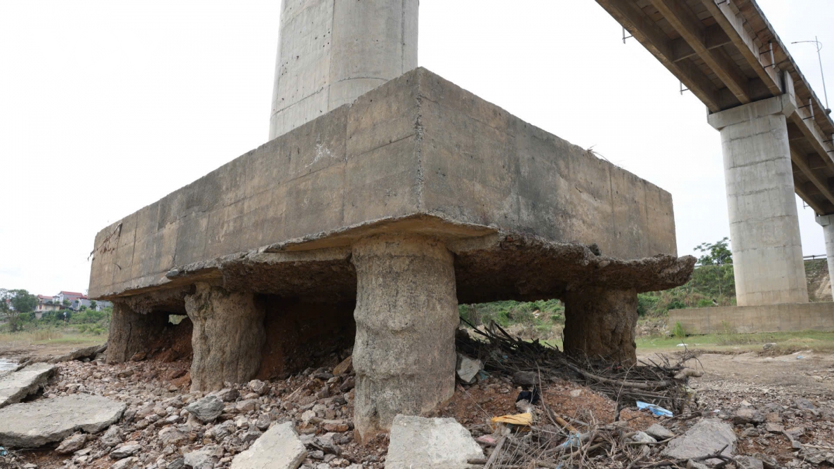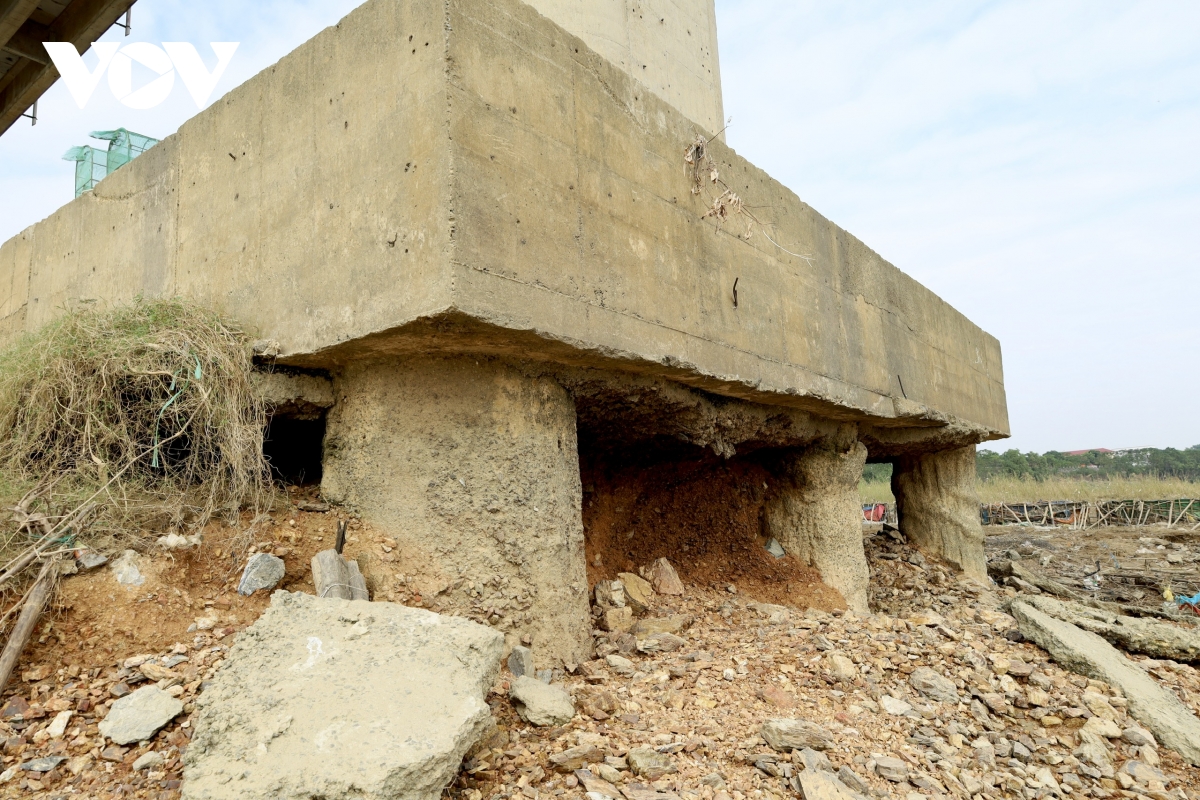 Ngay dưới chân trụ, nhiều khoảng rỗng lớn xuất hiện. Đất đá và bê tông mục rã bị dòng chảy cuốn đi, tạo nên những hốc sâu. Có thể thấy rõ phần móng bị khoét như hàm ếch.