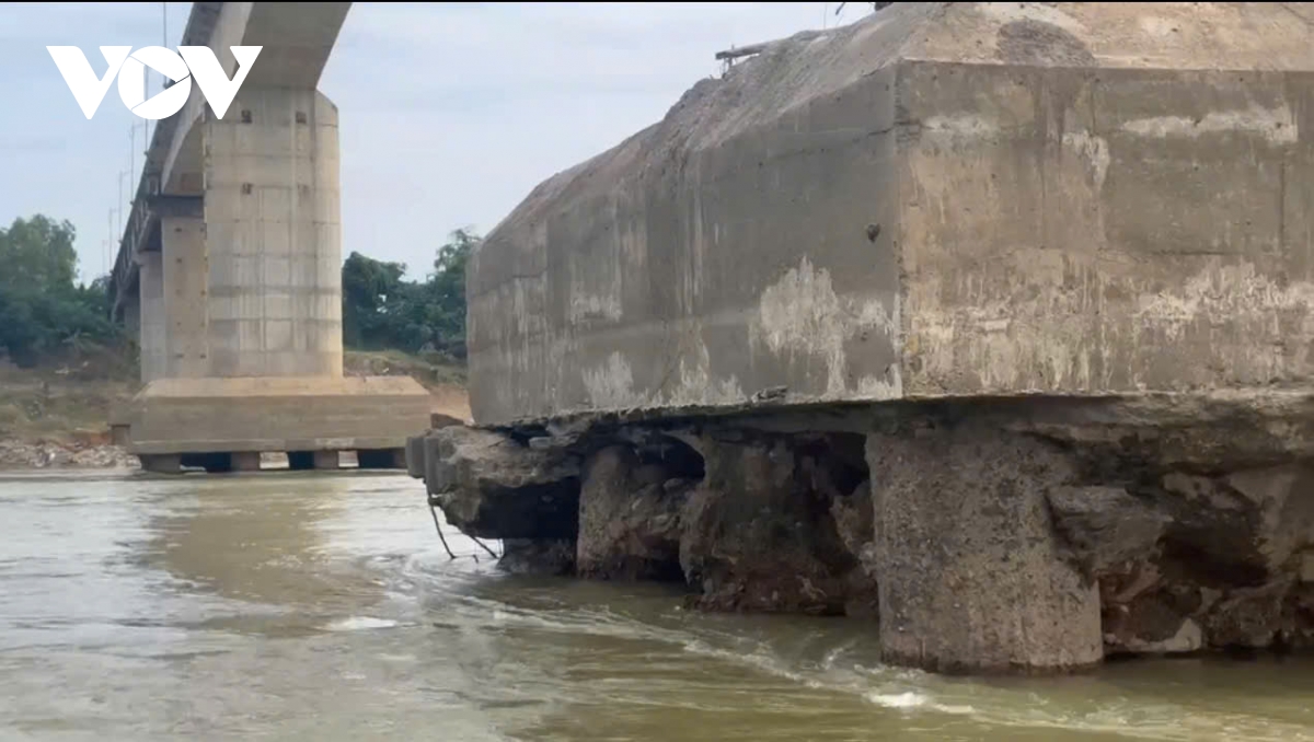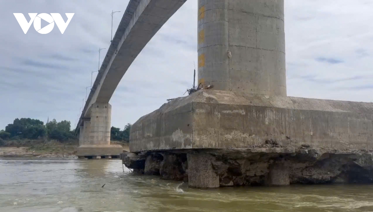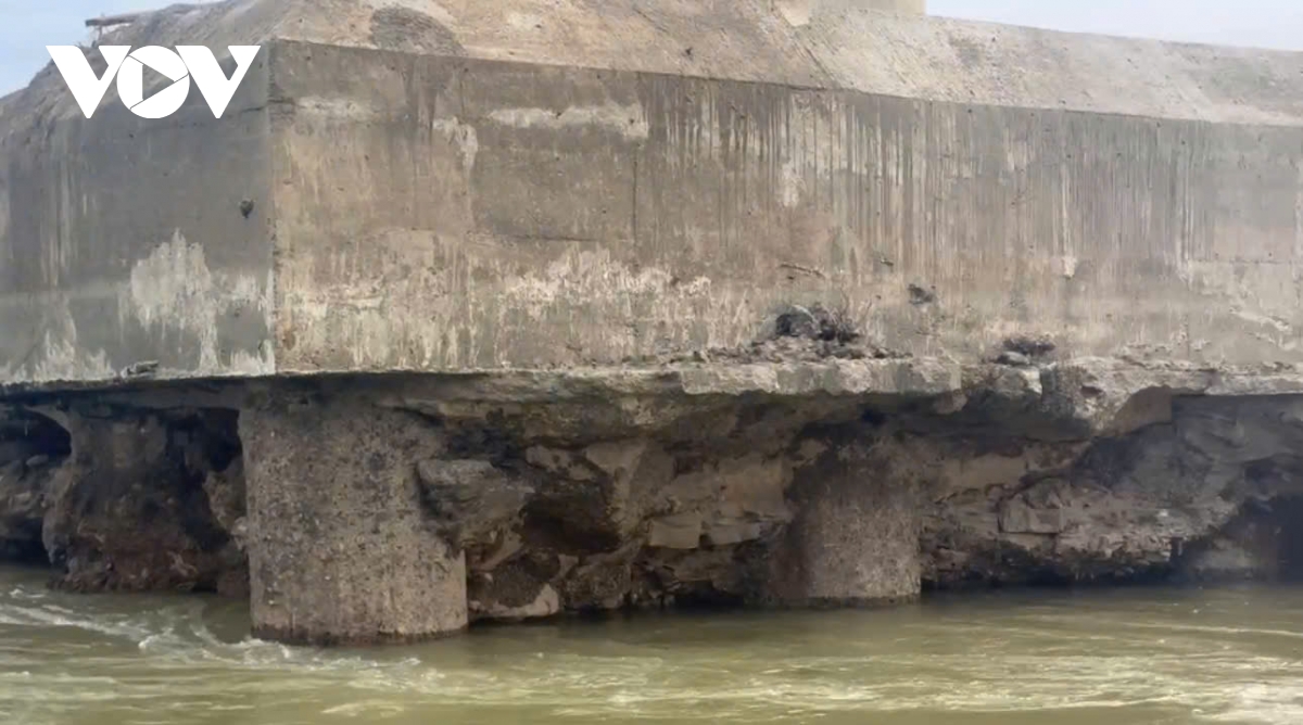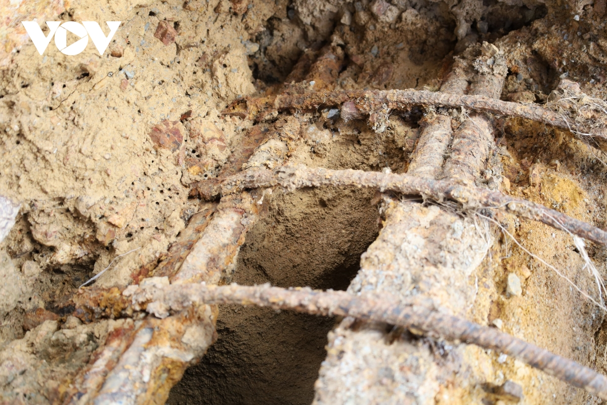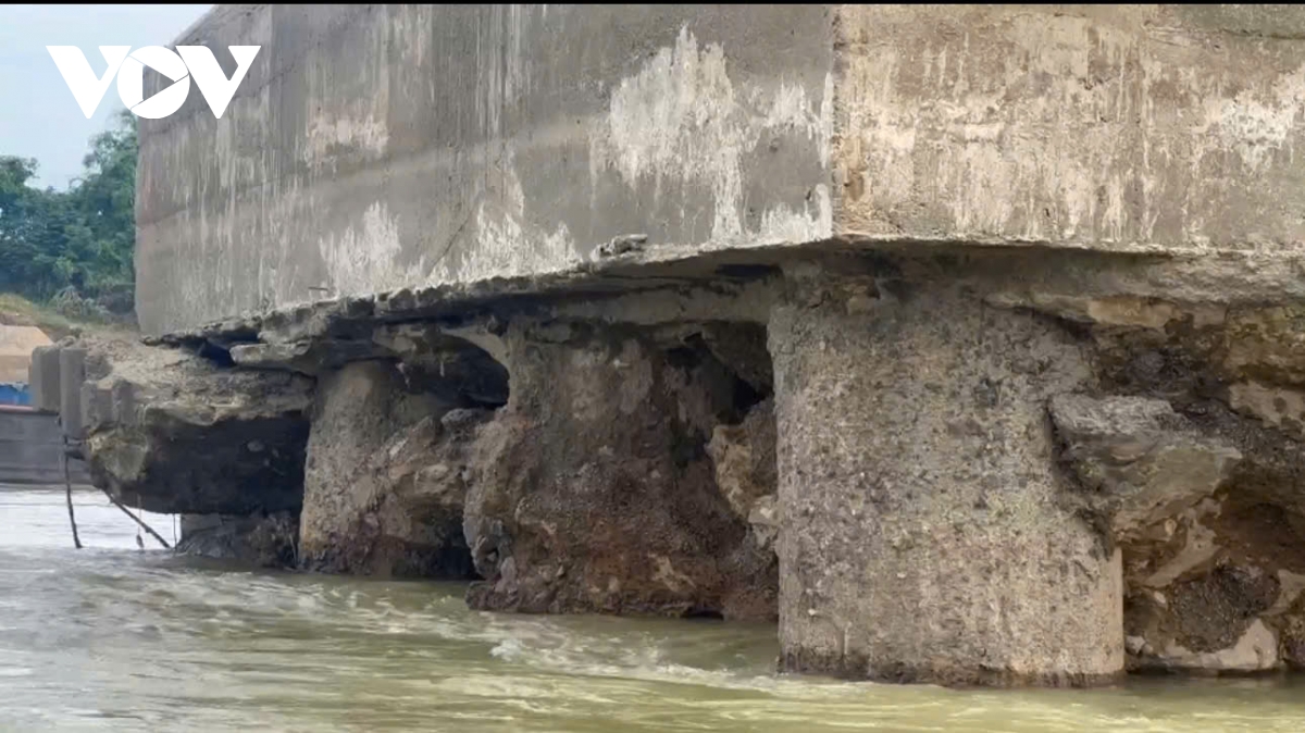 Ngay dưới chân trụ, nhiều khoảng rỗng lớn xuất hiện. Đất đá và bê tông mục rã bị dòng chảy cuốn đi, tạo nên những hốc sâu. Có thể thấy rõ phần móng bị khoét như hàm ếch.