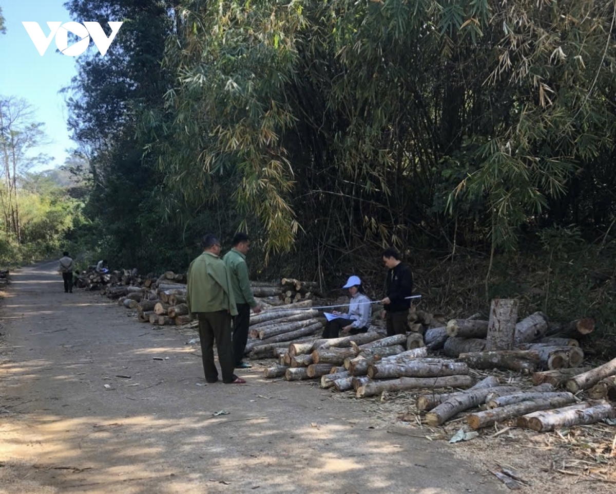 Lực lượng chức năng kiểm đếm tại hiện trường phá rừng, khai thác gỗ trái phép.