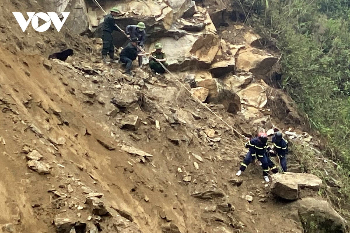 Để đảm bảo an toàn khi cứu hộ, lực lượng chức năng đã phải sử dụng dây dòng dọc thả từ trên xuống để xử lý đất đá trên sườn núi