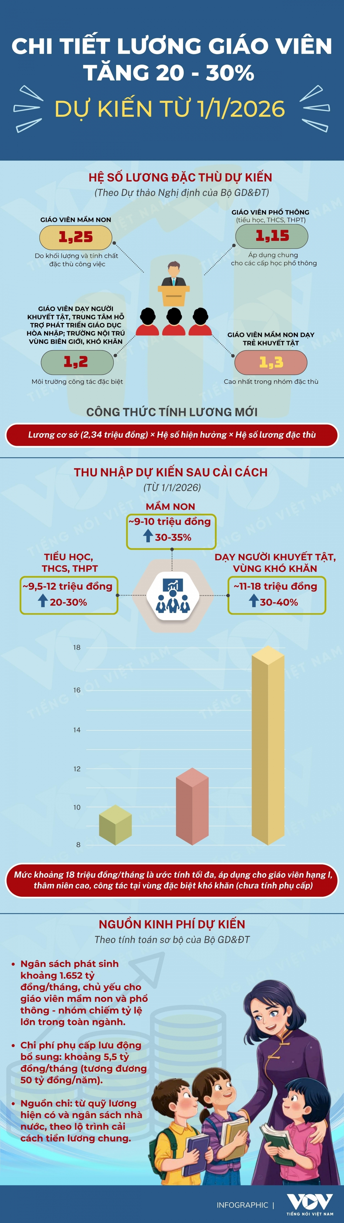 VOV.VN - Dự thảo Nghị định quy định chính sách tiền lương và chế độ phụ cấp đối với nhà giáo đang được Bộ GD&ĐT trình Chính phủ phê duyệt, dự kiến có hiệu lực từ ngày 1/1/2026. Đây là bước đi cụ thể nhằm cải thiện đời sống giáo viên, giải bài toán thiếu nhân lực và tăng sức hút của nghề giáo.