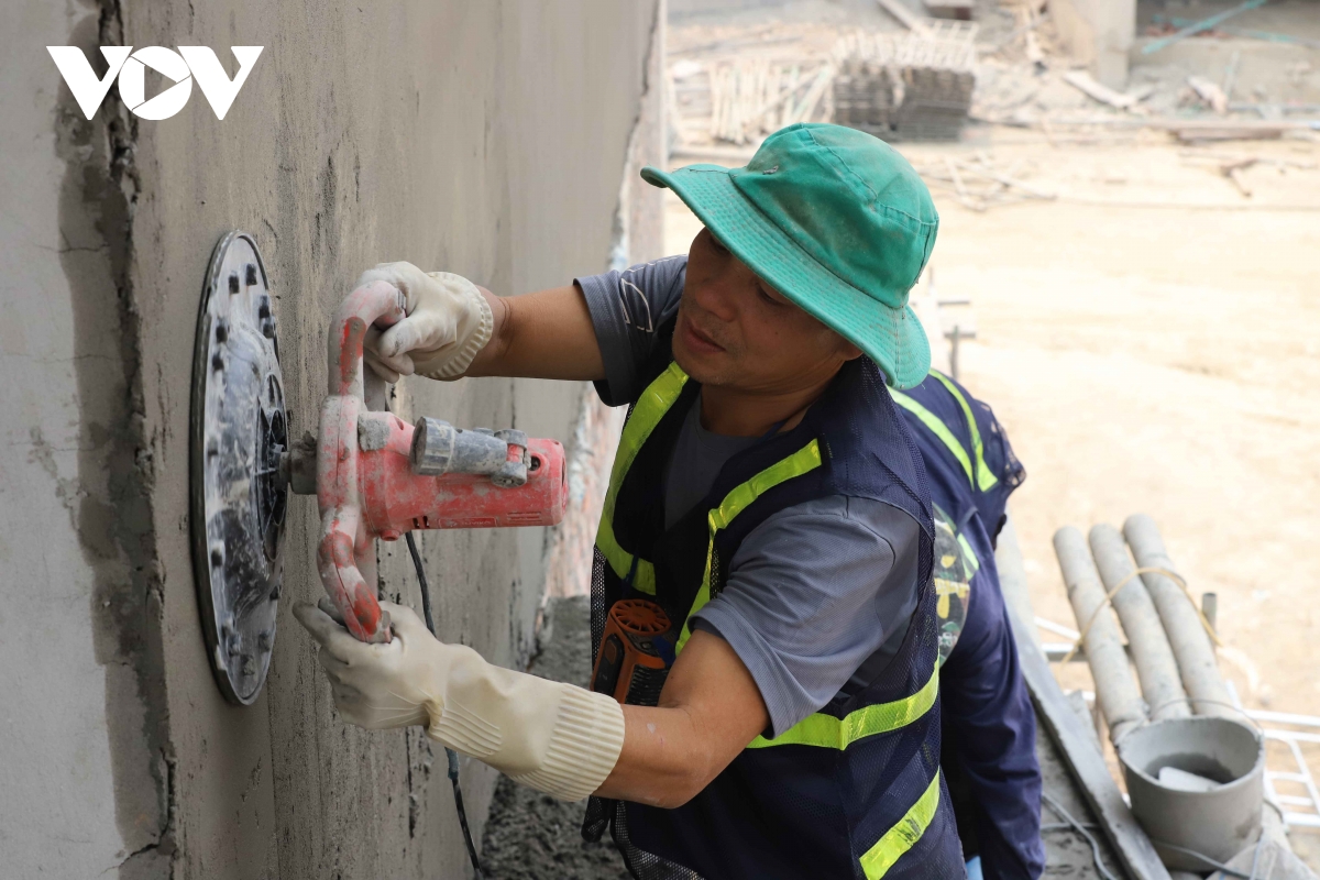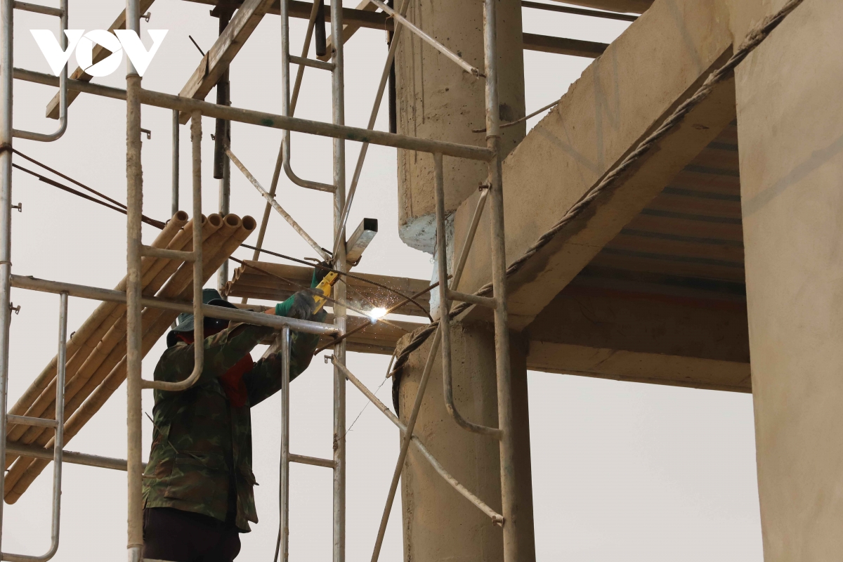 Lực lượng thi công bám trụ công trường xuyên ngày đêm, quyết tâm hoàn thành công trình đúng tiến độ.