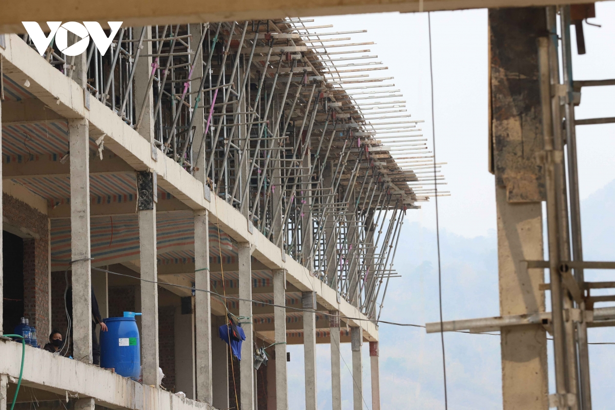 Công nhân tất bật đổ bê tông, trát tường... tranh thủ từng giờ để kịp tiến độ trong điều kiện thời tiết thất thường nơi vùng cao.