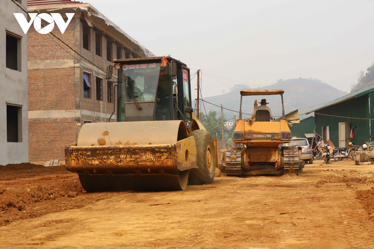 Tại công trình trường nội trú liên cấp xã Lóng Phiêng, không khí thi công diễn ra sôi động, hàng trăm công nhân, máy móc hoạt động liên tục để đảm bảo tiến độ đề ra.