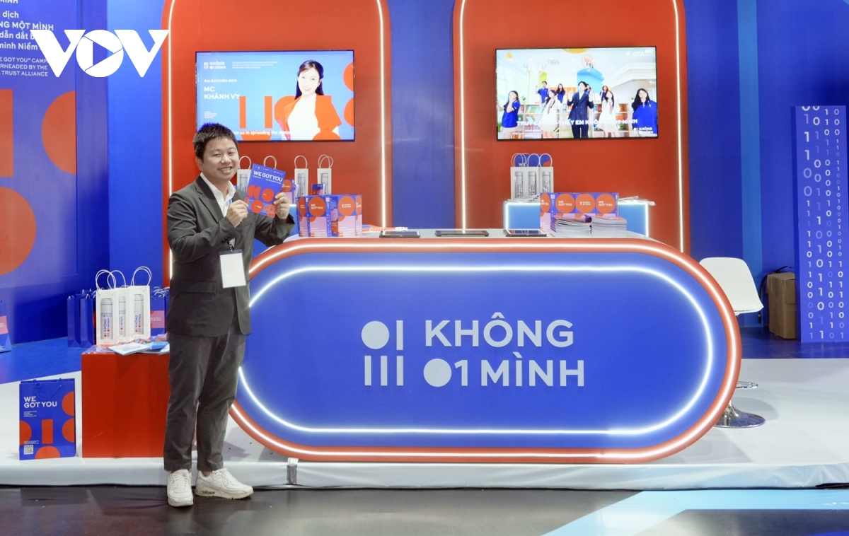 Tại đây, khách tham quan có thể theo dõi các video và phóng sự giới thiệu hành trình của chiến dịch “Không Một Mình”, cùng những câu chuyện truyền cảm hứng từ các đại sứ trẻ. Khu trưng bày còn giới thiệu nhiều tài liệu truyền thông và ấn phẩm hướng dẫn giúp người xem nâng cao nhận thức, kỹ năng phòng tránh rủi ro trên không gian mạng. Ngoài ra, khách tham quan có thể trải nghiệm bài trắc nghiệm tương tác trên thiết bị điện tử để kiểm tra kiến thức và thực hành kỹ năng nhận diện lừa đảo, xâm hại trực tuyến.