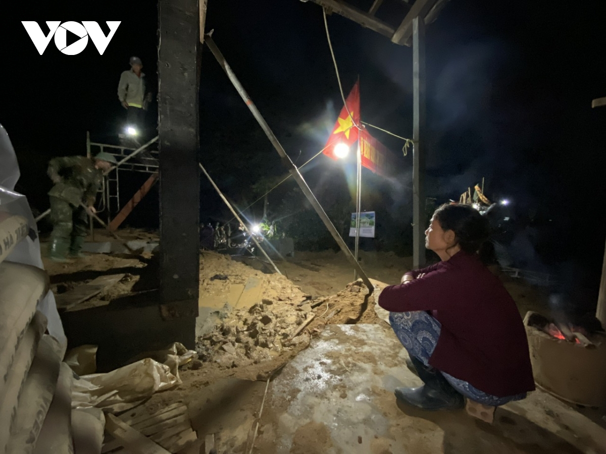 Trong đêm, ánh đèn công trường thắp lên niềm tin và hy vọng cho người dân sau quá nhiều mất mát. Bà Nguyễn Thị Thiểu, đội 3, thôn Phú Hữu, xã Hoà Thịnh, đang thức cùng bộ đội, chờ mong ngôi nhà mới dựng lại từ đổ nát.
