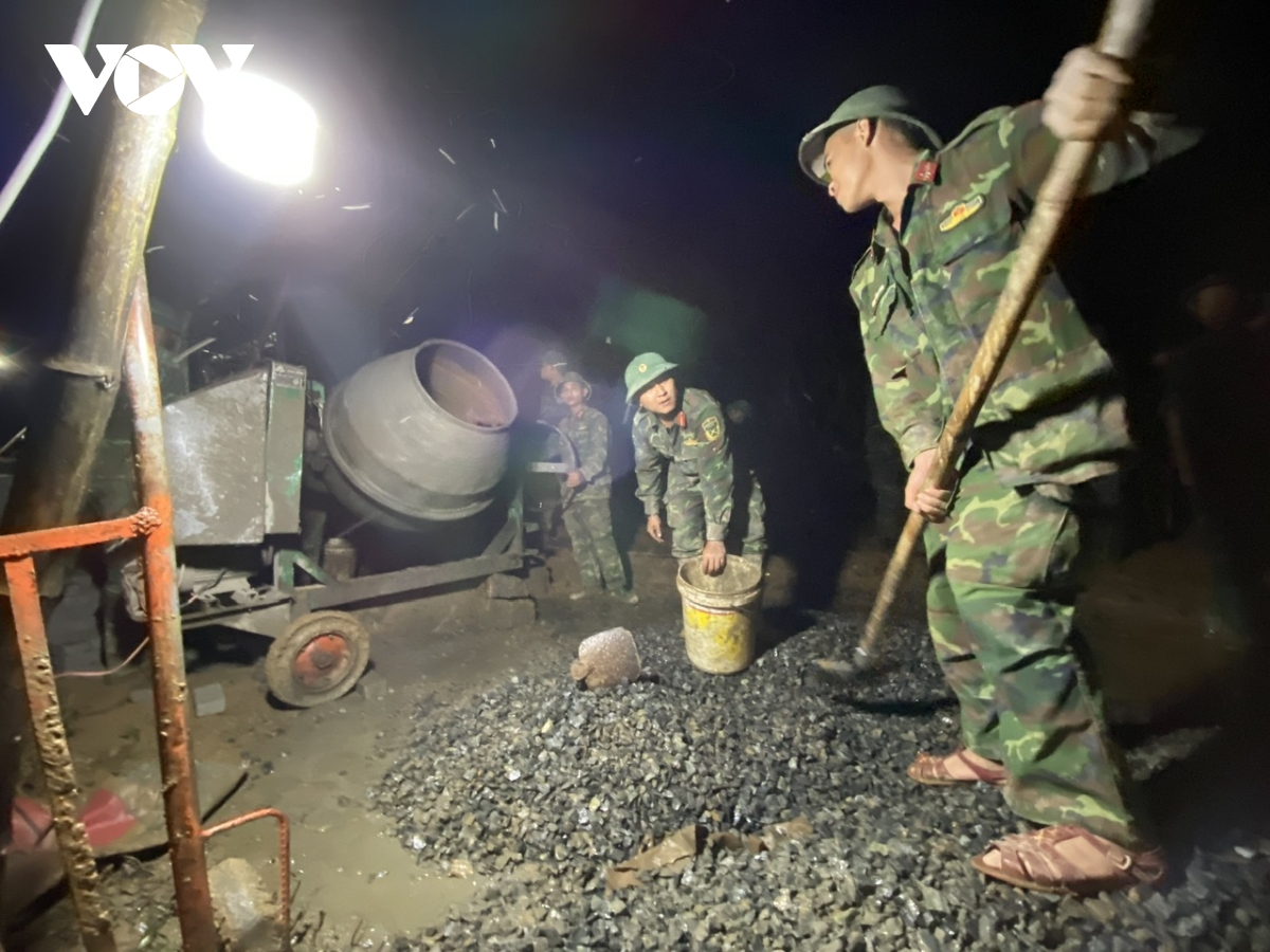 Những người lính lặng lẽ trộn từng mẻ bê tông, dựng lại mái nhà cho bà con vùng lũ.