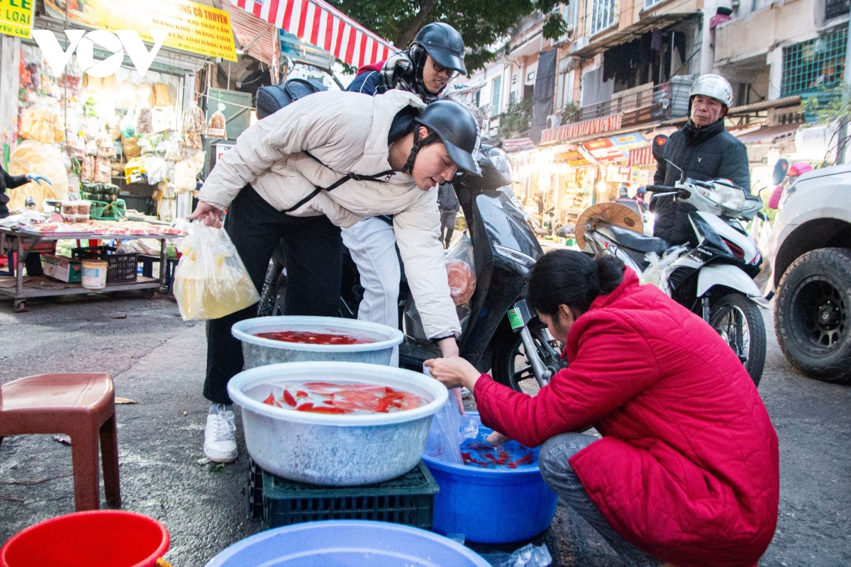 Ngoài các mặt hàng thực phẩm, theo ghi nhận của phóng viên, cá chép cúng ông Công, ông Táo cũng được bày bán khá phong phú. Sau khi mua sắm đủ mâm lễ, người dân tìm mua cá chép đỏ với giá 50.000 đồng/3 con về cúng.