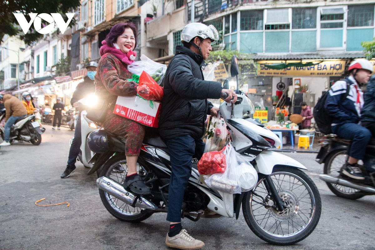 Xe máy treo đầy ắp đồ cúng lễ cho ngày tiễn ông Công, ông Táo chầu trời, ai cũng vội vàng mua sắm thật nhanh để về bày biện mâm cỗ dâng lên bàn thờ tổ tiên.