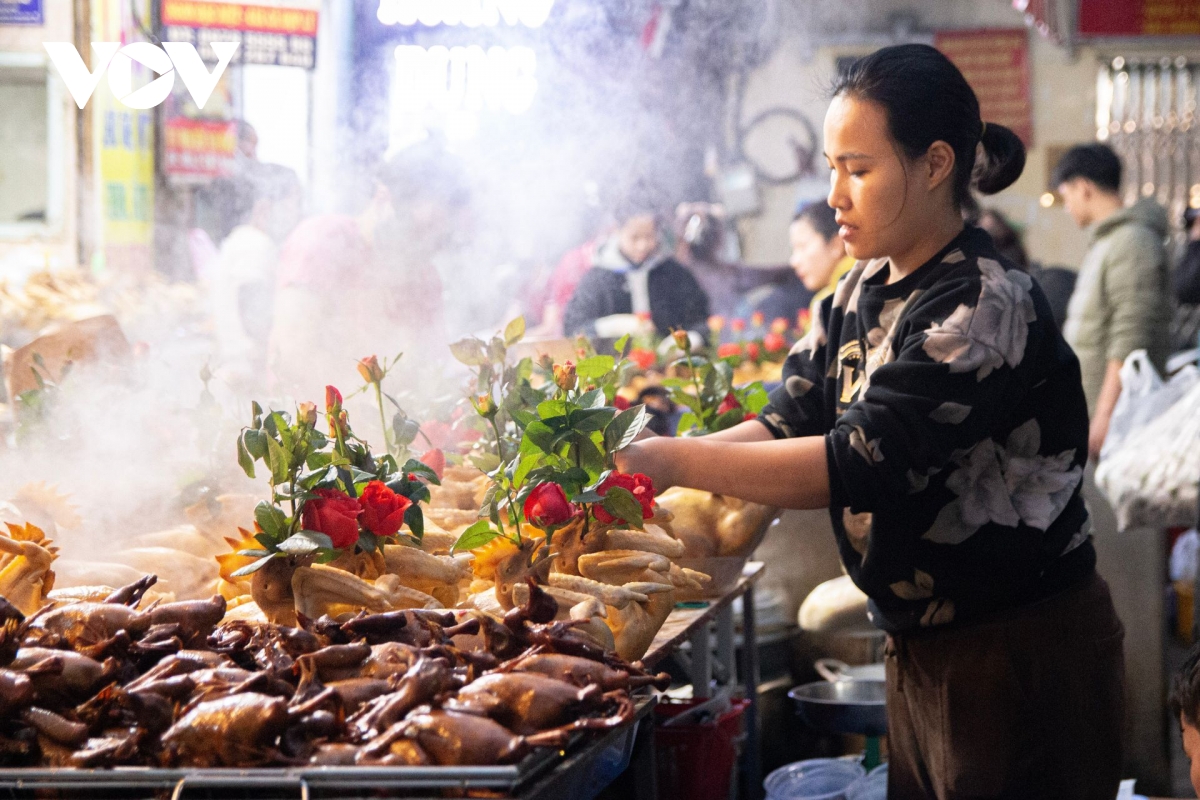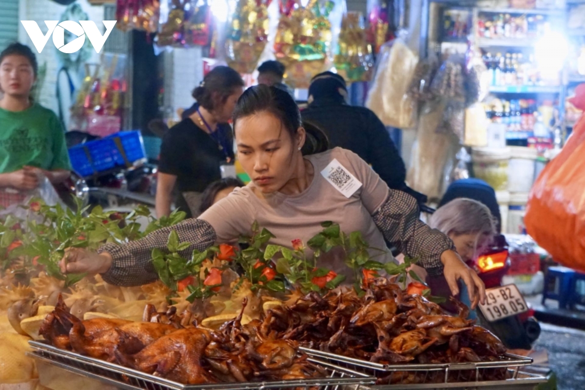 VOV.VN - Rạng sáng ngày 23 tháng Chạp, nhiều người dân Thủ đô đã có mặt tại khu chợ “nhà giàu” Hàng Bè (phường Hoàn Kiếm, Hà Nội) để mua đồ lễ cúng ông Công, ông Táo sớm, gà ngậm hoa hồng có giá lên đến 700.000 đồng/con nhưng rất đắt khách.