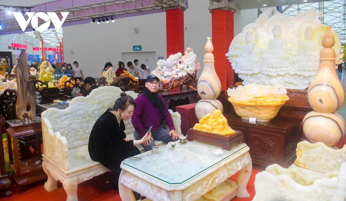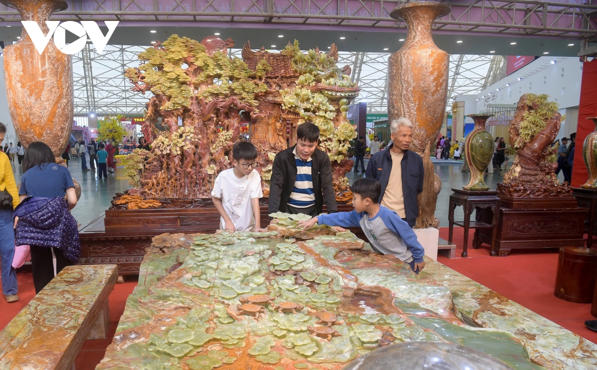 Hội chợ Mùa Xuân 2026 trưng bày hàng loạt tác phẩm từ đá quý được chế tác tinh xảo, có giá trị lớn, thu hút đông đảo người dân đến tham quan, mua sắm, chiêm ngưỡng.