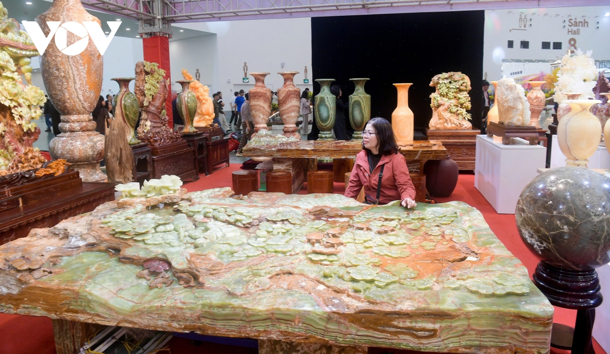 Không chỉ gian hàng gỗ quý mà ở gian hàng đá quý thu hút khách nhiều người tham quan, mua bán... Cụ thể là bộ bàn trà chế tác nguyên khối từ đá onyx với giá 9 tỷ đồng cũng gây chú ý, trở thành điểm nhấn tại gian hàng.