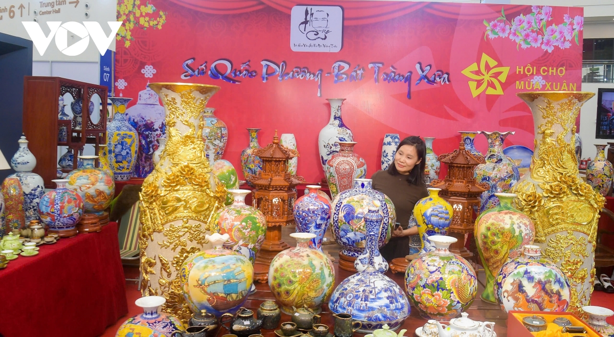 Ngoài gỗ và đá quý ra, gian hàng gốm sứ cao cấp đông khách không kém. Tại gian hàng gốm sứ Bát Tràng của nghệ nhân Đặng Thị Lan, có một cặp lục bình bách điểu chầu hoàng với giá trị gần 600 triệu đồng được nhiều người ra vào xem rất nhiều.