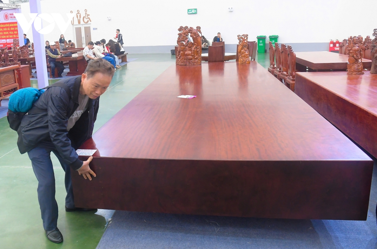 Ngay những ngày đầu, các gian hàng đồ gỗ hút khách vì những sản phẩm choáng ngợp và mức giá "khủng". Cụ thể, trên hình là sản phản gỗ dáng bàn họp được chủ gian hàng cho biết làm từ loại gỗ cẩm lai hàng nghìn năm tuổi. Với kích thước dày 40cm, ngang 1,95m và dài 6,3m có giá niêm yết gần 1,5 tỉ đồng.