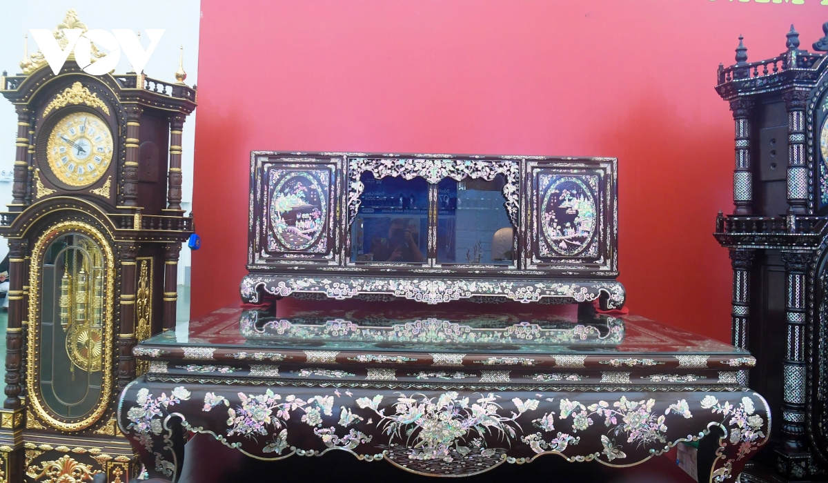 Tiếp đến là đồ gỗ của một gian hàng đến từ tỉnh Ninh Bình, với chiếc giường siêu đẹp hay còn gọi là "Giường Long Sàng" với giá gần 600 triệu đồng...