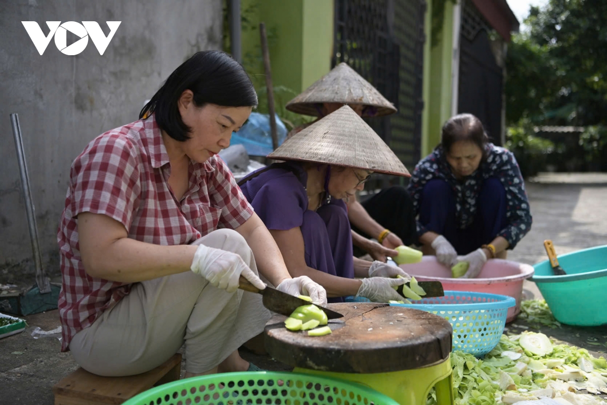 Không ai phân công nhưng mỗi người một việc, phối hợp nhịp nhàng để chế biến 4, 5 loại đồ ăn cho cả nghìn hộp cơm.