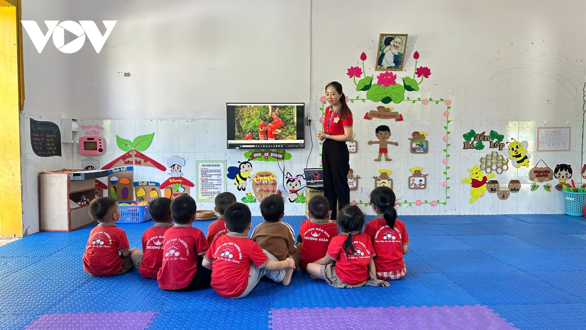 Điểm trường có 30 trẻ, chia thành 2 lớp, 100% trẻ là người dân tộc thiểu số, trong đó có tới 1/3 là con em thuộc hộ nghèo, hộ cận nghèo thuộc thôn vùng đặc biệt khó khăn. Cô Phạm Thị Bách chia sẻ: Lớp học ở đây đã cũ bởi được xây dựng khá lâu, đồ dùng học tập còn hạn chế nên các cô giáo luôn cô gắng sáng tạo thêm những món đồ chơi, những thiết bị dạy học từ những vật dụng sẵn có để các em tiếp thu bài tốt hơn.