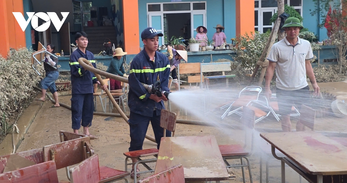 Trong ngày 9/10, Lực lượng Cảnh sát PCCC&CNCH Thái Nguyên đã tăng cường hàng chục cán bộ, chiến sĩ cùng phương tiện để hỗ trợ các cơ sở giáo dục dọn dẹp. Đơn vị đã lau rửa các phòng học, sân trường, bàn ghế tại Trường Tiểu học và THCS 915 Gia Sàng, cùng với Trường Mầm non Điện lực Quang Vinh, nhằm giúp các em học sinh sớm được trở lại trường học. Lực lượng Cảnh sát PCCC&CNCH sử dụng lăng phun nước để vệ sinh và làm sạch phòng học, bàn ghế.