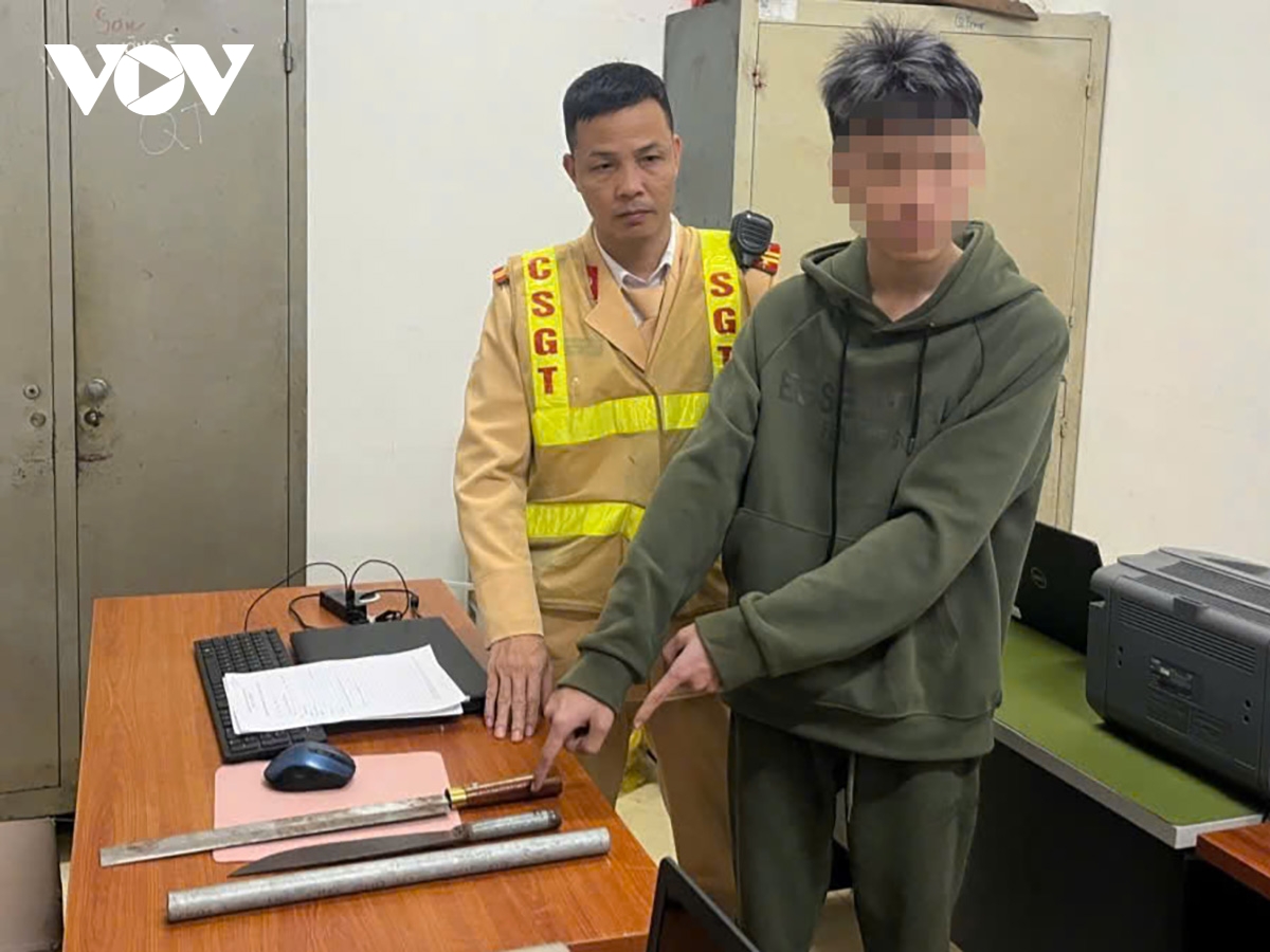 VOV.VN - Ngày 2/12, Cảnh sát giao thông CATP Hà Nội cho biết, vừa kịp thời ngăn chặn nhóm thanh niên điều khiển xe máy che biển số, mang theo hung khí và có hành vi gây rối trật tự công cộng trên tuyến Quốc lộ 32.