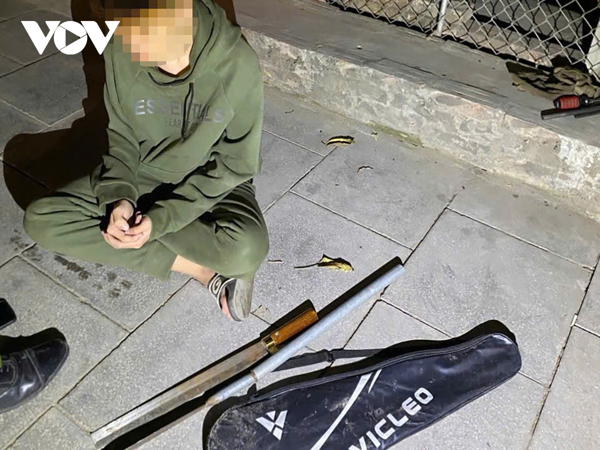 Tiến hành kiểm tra, lực lượng chức năng phát hiện trong túi đựng vợt cầu lông có 1 tuýp sắt và 2 con dao. Đối tượng khai tên T. C. H (sinh ngày 2010; trú tại Hà Nội).