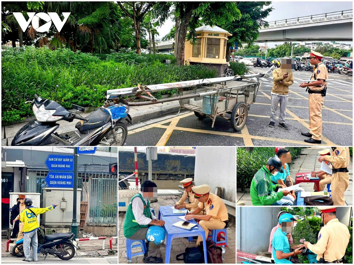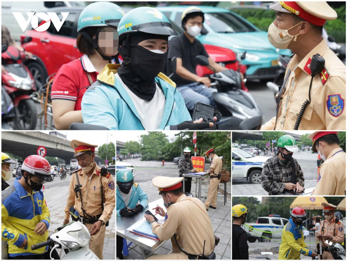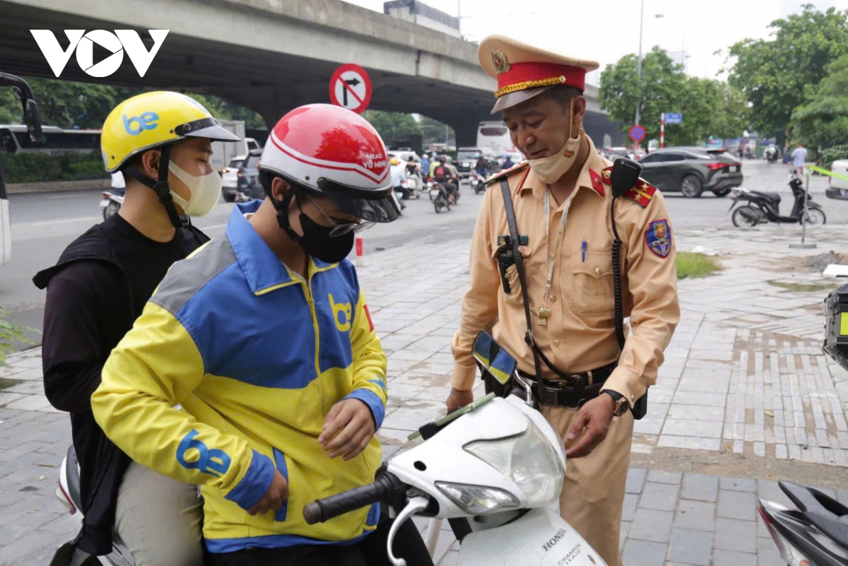 VOV.VN - Sáng 4/6, lực lượng CSGT Hà Nội đã kiểm tra, xử lý hàng loạt tài xế xe ôm công nghệ vượt đèn đỏ, đi ngược chiều, không đội mũ bảo hiểm, điều khiển xe lên vỉa hè, chở hàng hóa cồng kềnh và che biển kiểm soát.