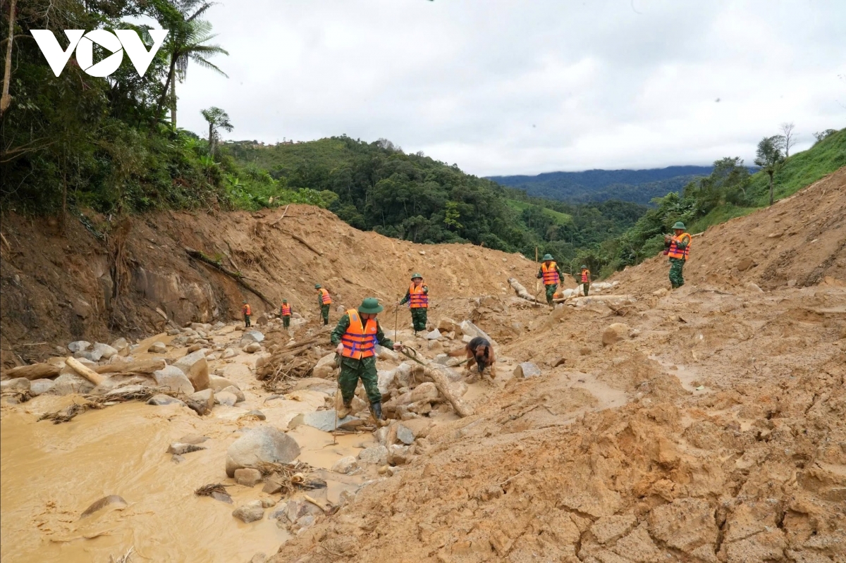 Đại tá Phan Văn Thí, Phó Chỉ huy trưởng, Tham mưu trưởng Bộ đội Biên phòng thành phố Đà Nẵng cho biết, lực lượng tìm kiếm khoanh vùng khu vực nghi ngờ có thi thể 2 nạn nhân, đồng thời mở rộng tìm kiếm theo dòng chảy và bãi bồi đất đá do sạt lở tạo ra: “Phối hợp với các lực lượng địa phương di dời nhân dân đến các vị trí an toàn. Hiện nay thì cơ bản là chúng tôi đảm bảo được đời sống bà con, không có tình trạng là bà con thiếu đói trong thời gian là tránh mưa lũ”.