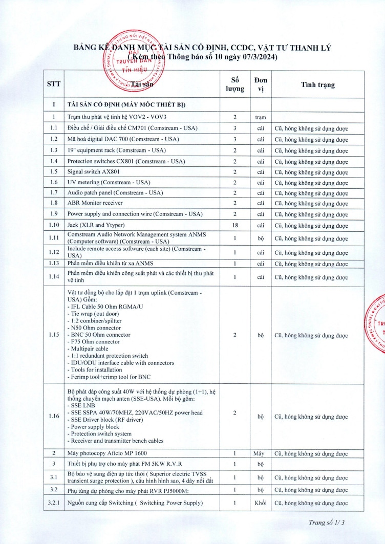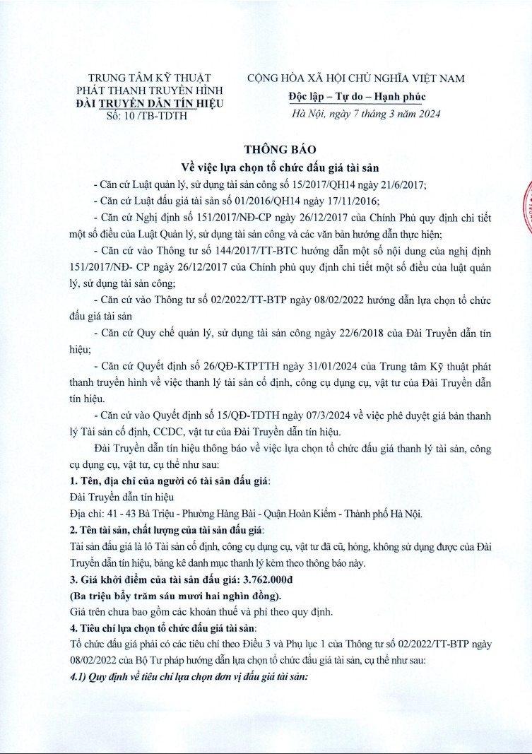 Đài Truyền dẫn tín hiệu thông báo về việc lựa chọn tổ chức đấu giá thanh lý tài sản, công cụ dụng cụ, vật tư, cụ thể như sau:
