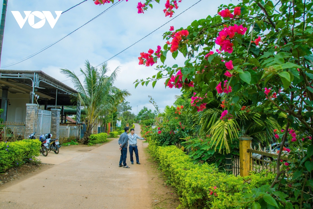 Kết thúc một vụ mùa cà phê bội thu với giá cao nhất lịch sử, người dân thôn Đức An, xã biên giới Thuận An, huyện Đắk Mil, tỉnh Đắk Nông phấn khởi chăm chút nhà cửa và đường làng ngõ xóm để chuẩn bị đón năm mới. Hai bên đường thôn, càng thêm rực rỡ sắc màu hoa lá và căng tràn sức sống.