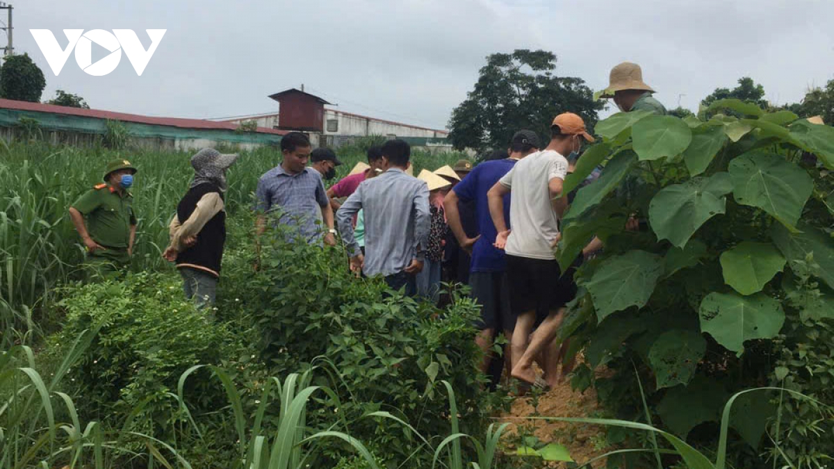 Sáng 10/6, sau khi phát hiện dưới hố chôn cải táng có nước "lạ" nghi là nước thải của trang trại lợn, nhiều người dân đã báo cáo với UBND xã, Công an xã Cẩm Long ra hiện trường chứng kiến.