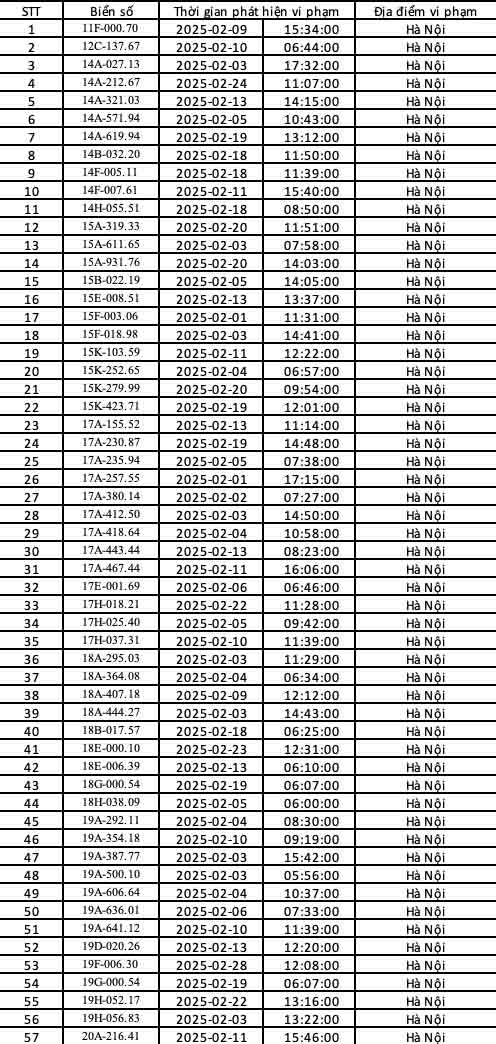 Danh sách ô tô bị phạt nguội tại Hà Nội trong tháng 1/2025 VOV.VN - Phòng Cảnh sát giao thông Công an TP Hà Nội vừa công bố danh sách phương tiện vi phạm hành chính về trật tự, an toàn giao thông đường bộ từ ngày 1/1/2025 đến ngày 31/1/2025, được ghi nhận qua hệ thống camera giám sát.