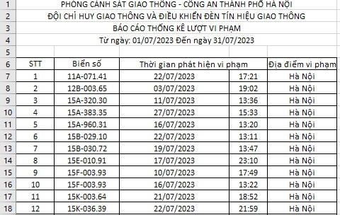 VOV.VN - Phòng Cảnh sát giao thông Công an TP Hà Nội vừa công bố danh sách phương tiện vi phạm hành chính về trật tự, an toàn giao thông đường bộ từ ngày 1/7/2023 đến hết ngày 31/7/2023, được ghi nhận qua hệ thống camera giám sát.
