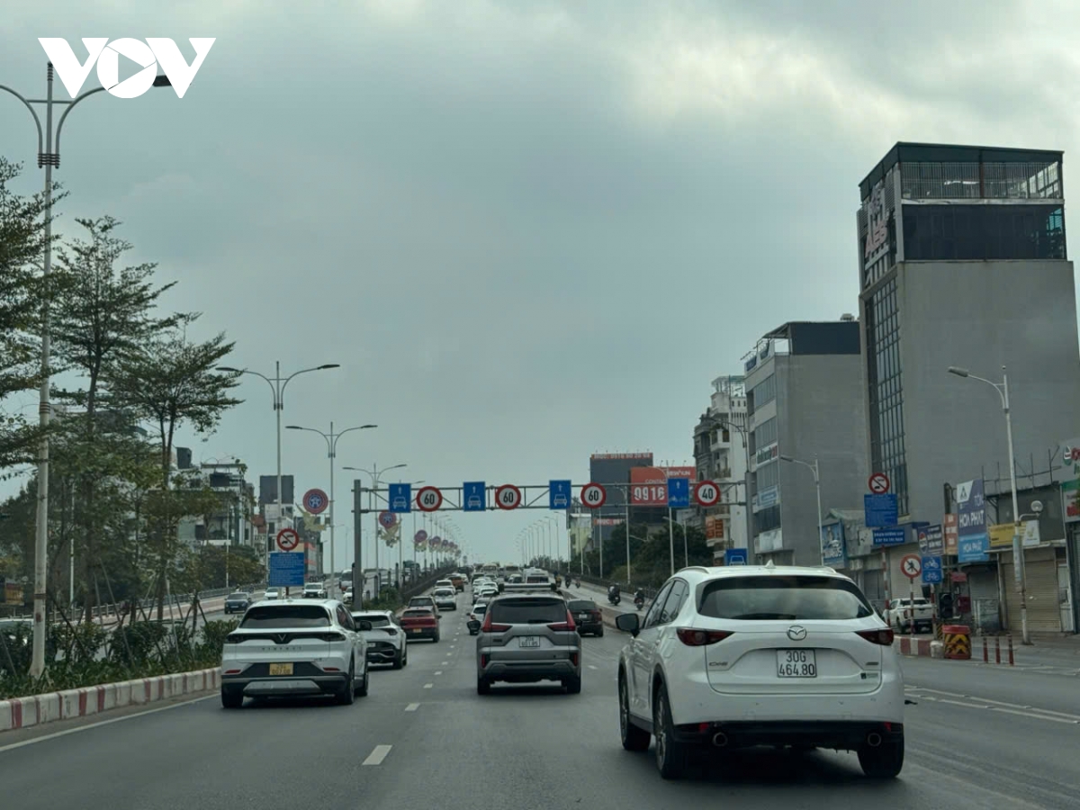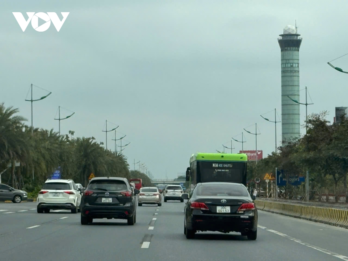 Đường Võ Nguyên Giáp trước sân bay Nội Bài đông xe nhưng không bị tắc.