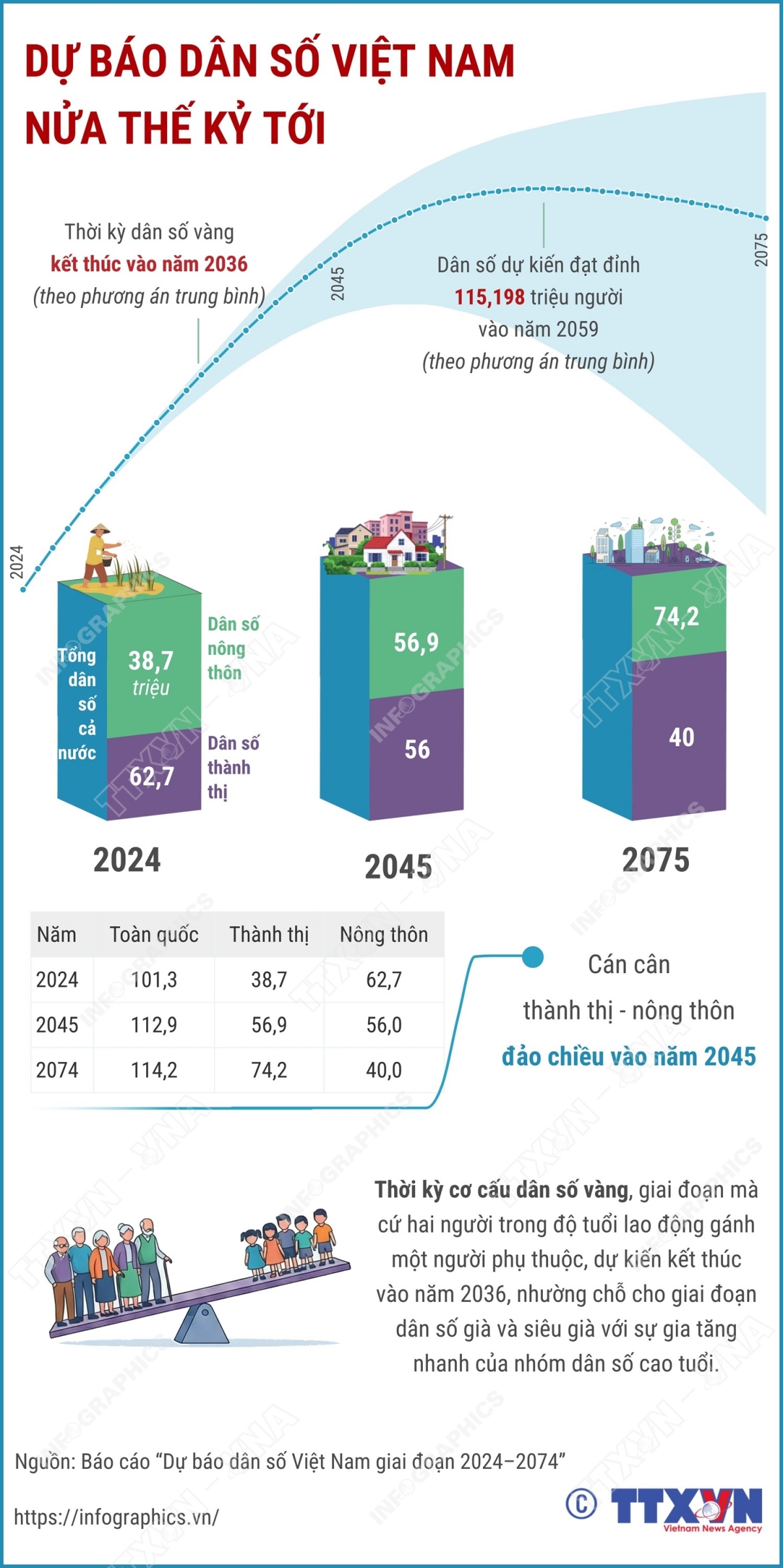 Theo dự báo, dân số Việt Nam tiếp tục tăng nhưng tốc độ tăng sẽ chậm dần và đạt đỉnh vào khoảng năm 2059 theo phương án mức sinh trung bình. Thời kỳ cơ cấu dân số vàng dự kiến kết thúc vào năm 2036, nhường chỗ cho giai đoạn dân số già và siêu già, với sự gia tăng nhanh của nhóm dân số cao tuổi. Như vậy, so với dự báo năm 2019, thời kỳ dân số vàng sẽ kết thúc sớm hơn 3 năm.