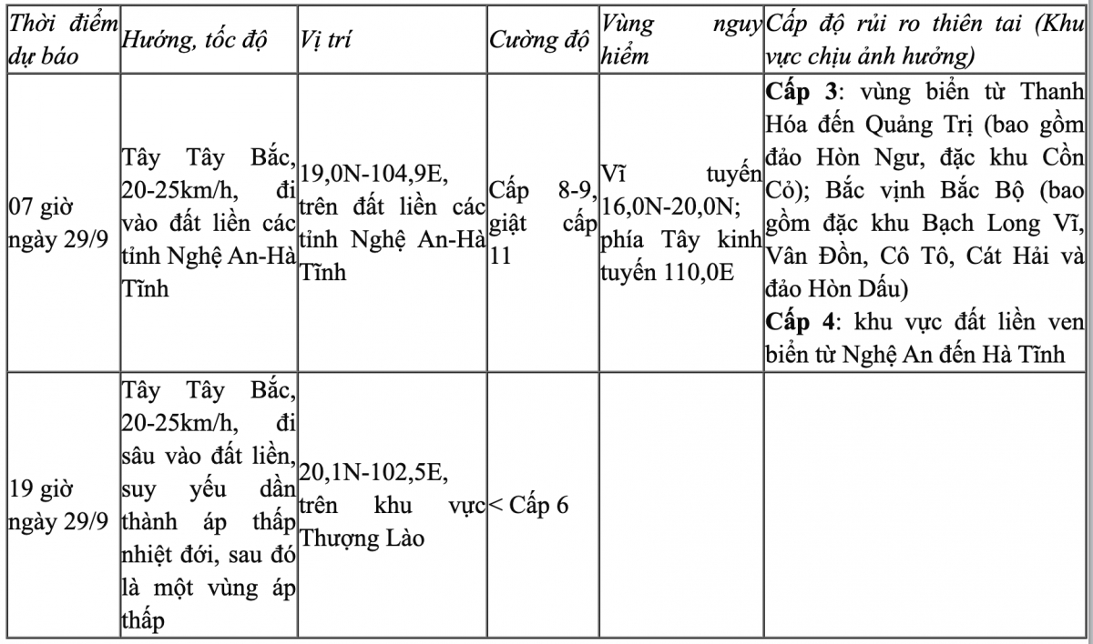 Hồi 19h ngày 28/9, vị trí tâm bão ở vào khoảng 17,7 độ Vĩ Bắc; 107,2 độ Kinh Đông, trên vùng ven biển Nghệ An-Quảng Trị. Sức gió mạnh nhất vùng gần tâm bão mạnh cấp 12 (118-133km/giờ), giật cấp 15. Di chuyển theo hướng Tây Tây Bắc, tốc độ 20-25km/h.