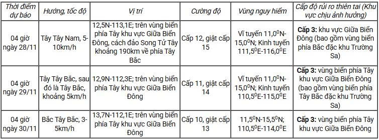 Hồi 4h ngày 27/11, vị trí tâm bão ở vào khoảng 13,0 độ Vĩ Bắc; 114,5 độ Kinh Đông, cách đảo Song Tử Tây khoảng 190km về phía Bắc. Sức gió mạnh nhất vùng gần tâm bão mạnh cấp 12 (118-133km/h), giật cấp 15. Di chuyển theo hướng Tây Tây Bắc, tốc độ khoảng 15km/h.