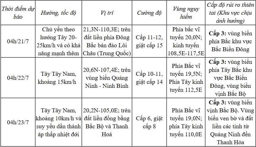 Từ tối và đêm 21/7, trên đất liền Quảng Ninh đến Thanh Hóa có gió mạnh dần lên cấp 7-9, giật cấp 10-11; sâu hơn trong đất liền gió mạnh cấp 6-7, giật cấp 8-9; vùng gần tâm bão cấp 10-11, giật cấp 14